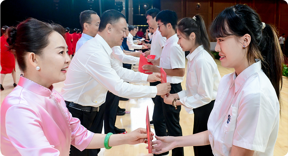 宝丰集团·燕宝慈善基金会理事长党彦宝(左二)与副理事长边海燕(左一)给受奖励学生发放燕宝奖学金