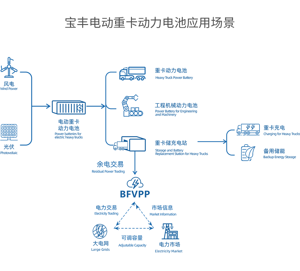 交通领域的碳排放主要来自于商用车,推广商用车新能源化是推动交通领域实现碳中和的关键路径,电动重卡动 力电池则是商用车快速高效安全实现新能源化的关键所在。宝丰是全球唯一一家涵盖光伏、发电、储能、动力电 池、电动卡车、储充电站一体式的综合性企业,全产业链穿透性管理,具有极强的综合成本优势。宝丰电动重卡 动力电池依托全产业链优势,产品性能优、续航里程长、安全性和智能化管理水平高,解决了商用车新能源动力 替代的市场化需求,快速完成产业商业化,助推交通领域深度脱碳。同时,配套建设的充电站统一管理站内电池 荷电状态,通过基于云平台的智能化管理系统,搭建负荷型虚拟电厂,可参与电网调度及需求侧响应。