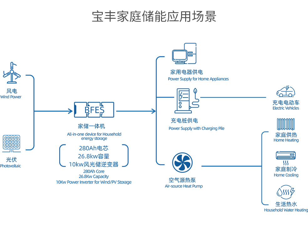 家庭储能系统具有节能环保、可再生、降低个人电力消费等优点,成为新兴市场亮点,消费需求和规模 不断增加。宝丰家庭储能系统是一套完整的家庭能源供应系统,集成小型风力发电机、分布式光伏组 件、空气源热泵、储能电池和多种电源接口,将风光发绿电用储能产品存储起来,为家用电器、新能源 汽车供电,并通过空气源热泵为家庭制冷、制热,替代了网电、煤、天然气、秸秆等家庭能耗,构建起 家庭能源绿色消费新模式,提高可再生能源利用率,提升供电质量和安全,降低家庭用电成本,助推绿 色能源进千家惠万户。